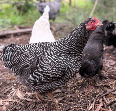 Nugget is our hand-raised Plymouth Rock heritage hen. She’s confident, curious, and full of personality.
