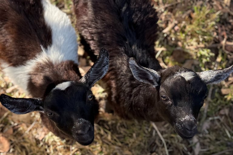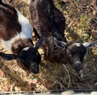 We have friendly pygmy goats that are debudded for safety. We also have a cuddly babydoll sheep, hens, chickens, rabbits, guinea pigs and ducklings.